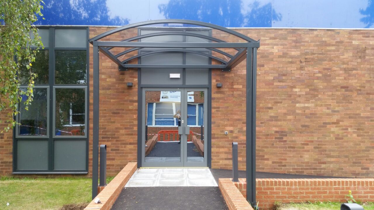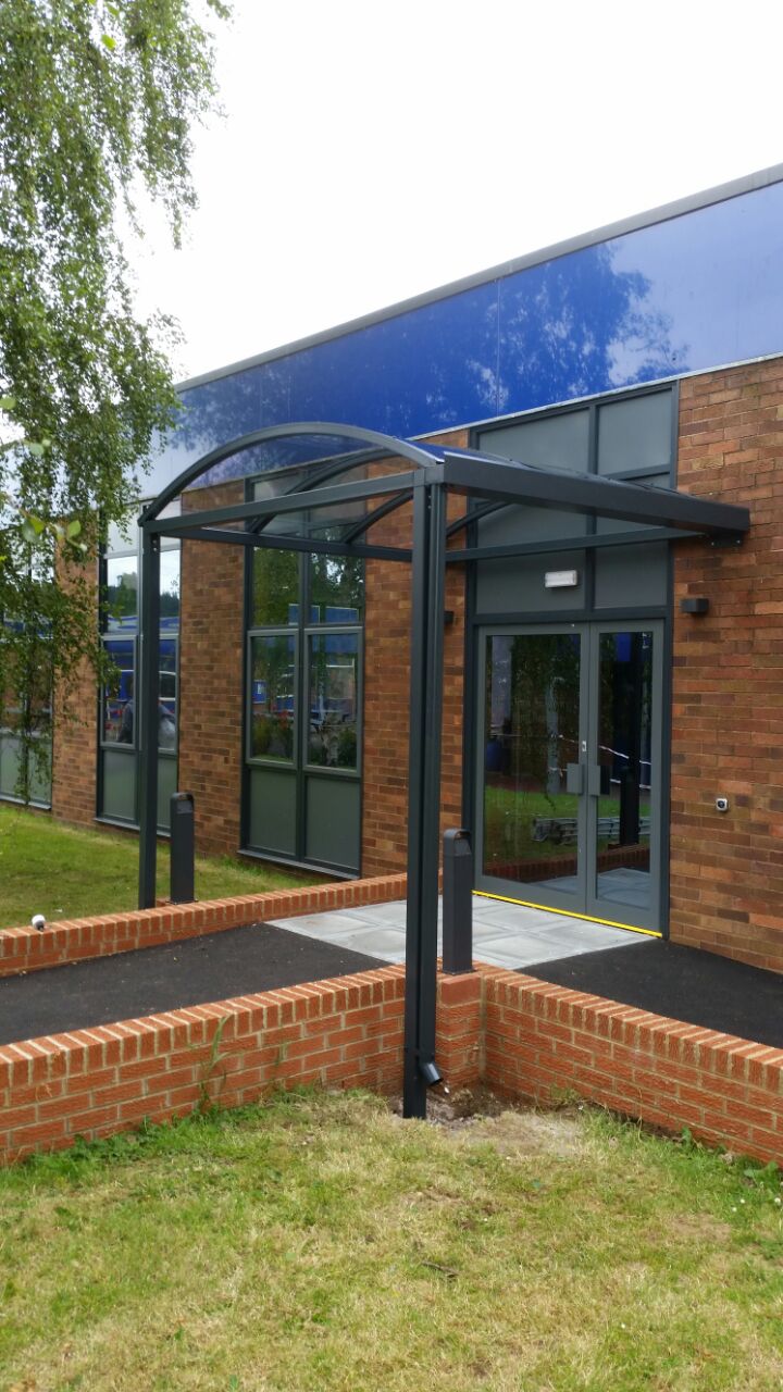 Door Entrance Canopy Glazed with Solid 8mm Thick Clear Polycarbonate Constructed from steel with aluminium arches. Fixed Back To Rear Wall and Retaining Wall. Installed by BBS Structural Glazing Ltd