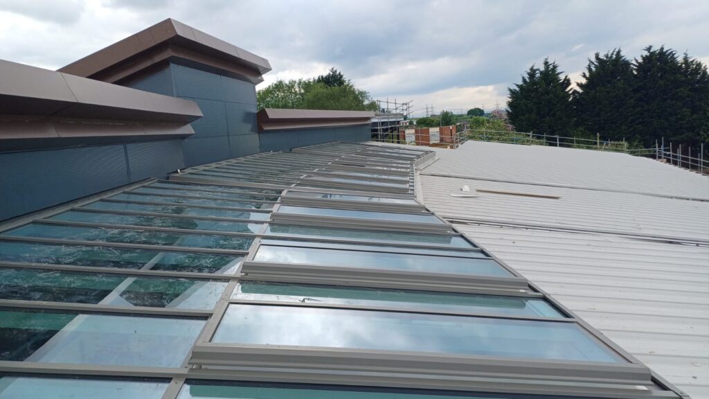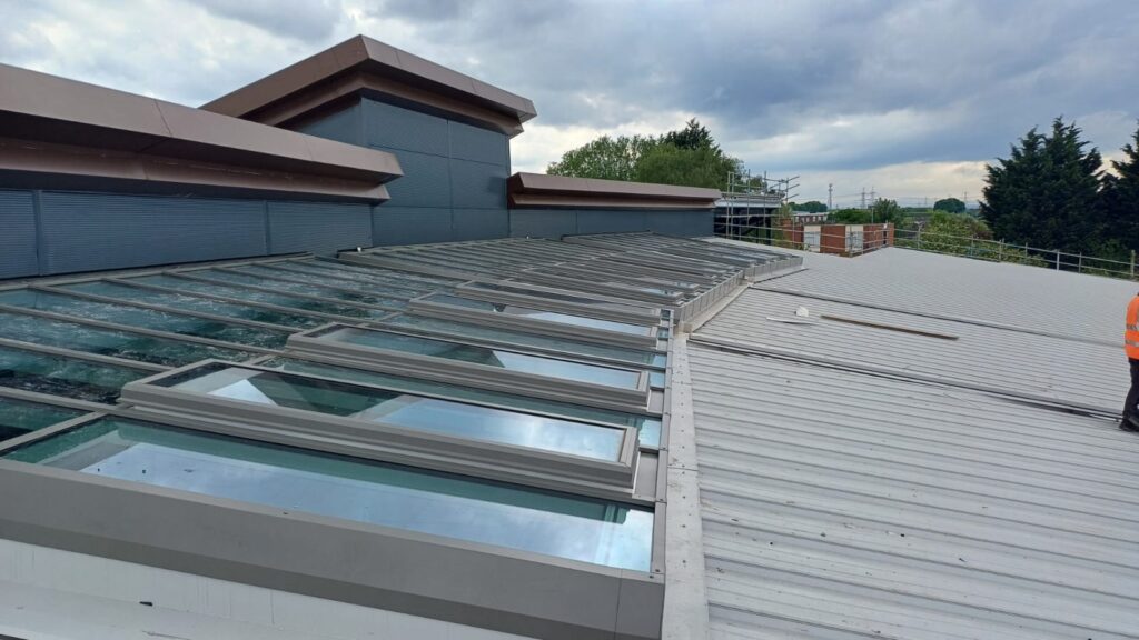 Various TN66/67 Class ‘1’ Non Fragile Specification Monopitch Rooflights glazed with Neutral Solar Control Safety Glass and Electronic opening Windows. All Rooflights installed by BBS Structural Glazing Ltd To Prepared Steel By Others.